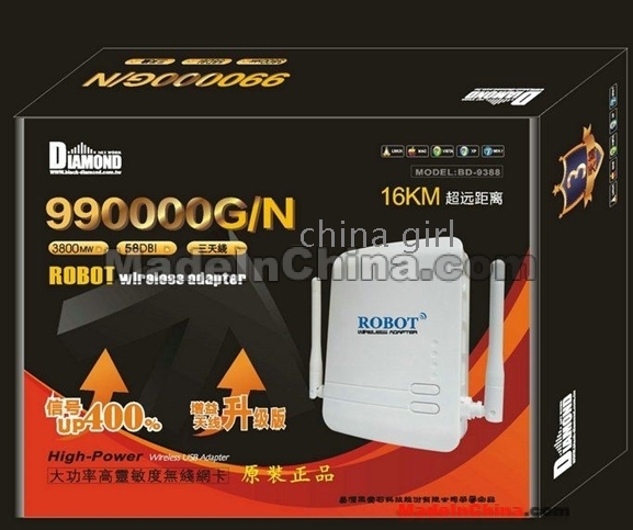 Hot selling ------- 2012 Nyeste Robot Wireless Adapter High -Power Black Diamond 990000G 802.11b / g 54Mbps 2000mW SMA 10dBi 8187L USB 2.0 WiFi Adapter Wireless Network Adapter helt ny fabrik lukket gratis forsendelse.